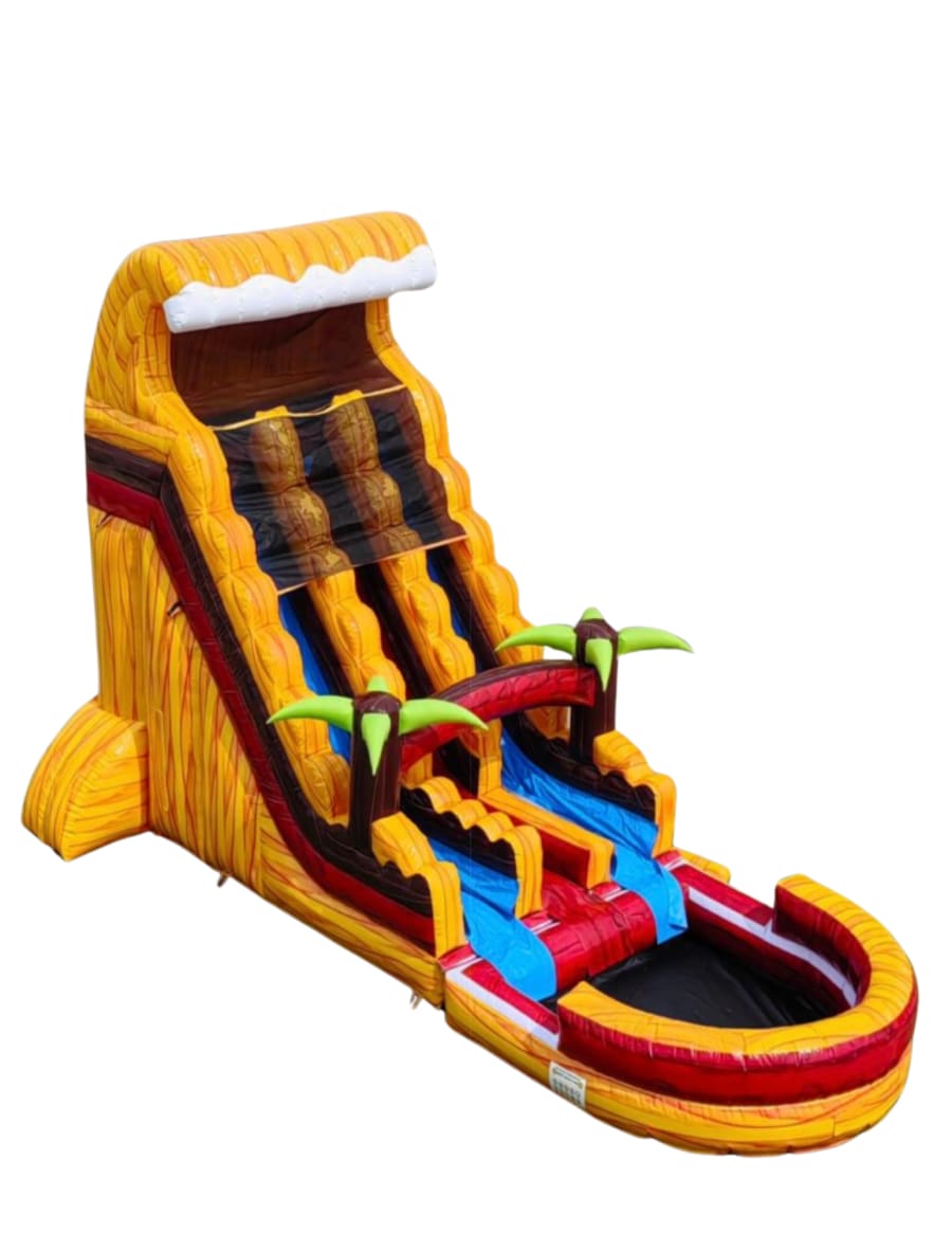 Dive into fun with our spectacular 2 Lanes Water Slide! Perfectly designed for both kids and adults, this vibrant water slide is the ideal addition to any event. With a stunning combination of yellow, brown, and red, and enhanced with playful palm trees, it guarantees to bring tropical fun to your festivities.